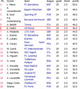 Kada bi se gledao samo broj postignutih pogodaka u ligi prvi bi bio Edison Kavani, napadač Pari sen Žermena sa 27 golova, ali je u francuskoj ligi koeficijent 1,5 pa je on prikupio 40,5 bodova.